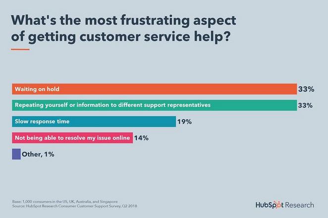 HubSpot Researchによると、私たちの66%は、カスタマーサービスのサポートを受けることの最も苛立たしい側面を、保留中またはさまざまな担当者への情報の繰り返しとして評価しています。