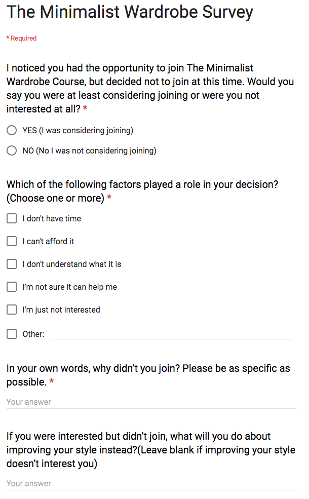 どの質問を顧客に尋ねるかは、ビジネスによって異なります。 しかし、私はピーターが選んだものが好きです。質問1は回答を修飾します。 誰かがミニマリストのワードローブを購入することを決して考えないのであれば、私たちはおそらく彼らの反応を気にしません。