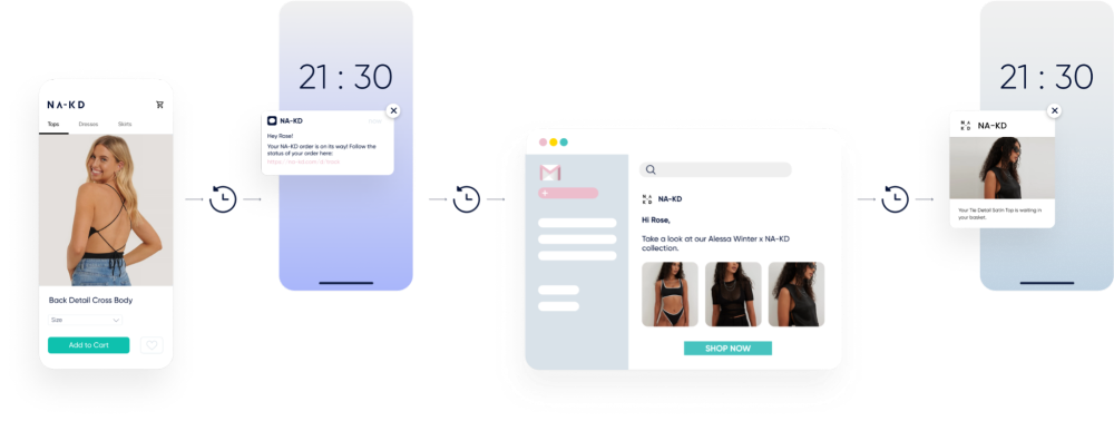 NA-KD の技術スタックは急速な成長に追いついていませんでした。 そのデータは複数のプラットフォームに存在しており、洞察を提供したり、360 度のビューでキャンペーンを推進したりすることができませんでした。 このプラットフォームは、顧客データを CDP に統合し、電子メール、Web プッシュ、SMS にわたる大規模なパーソナライズされたオムニチャネル キャンペーンを強化するためにInsider に注目しました。 Insider のクロスチャネル キャンペーン オーケストレーション ツールであるArchitect により、NA-KD はシームレスな顧客エクスペリエンスを提供し、顧客のお気に入りのチャネルで関連製品やコンテンツを紹介できるようになりました。 データドリブンでパーソナライズされたキャンペーンにより、 72 倍のROI と CLTV の25%増加を達成しました。