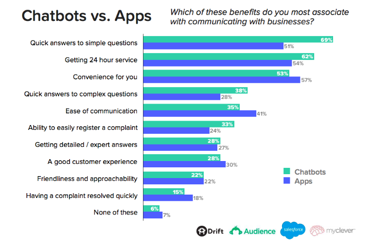 これらのソースの組み合わせが役立つかどうかを理解するには、それを使用する前に、チャットボットが消費者の関心を引くかどうかを理解する必要があります。 レポートによると、消費者の69%は、ブランドや企業とすばやくやり取りできるため、チャットボットを好みます。 ツールがビジネスのためにどのタスクを解決する必要があるかを考え、以下の統計を調べてください。 これは、チャットボットがあなたのビジネスに効果的であるかどうかを理解するのに役立ちます。