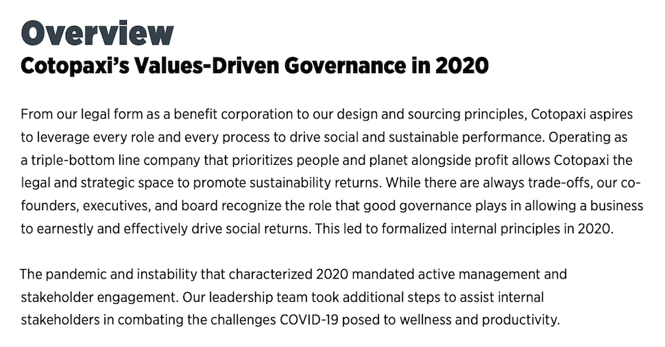 別のCSR志向のブランドであるCotopaxiも、社会的で持続可能な目標に向けて行った貢献を詳述した年次影響レポートを発行しています。 以下は、2020年のレポートに「概要」というタイトルのエグゼクティブサマリーとして表示されます。