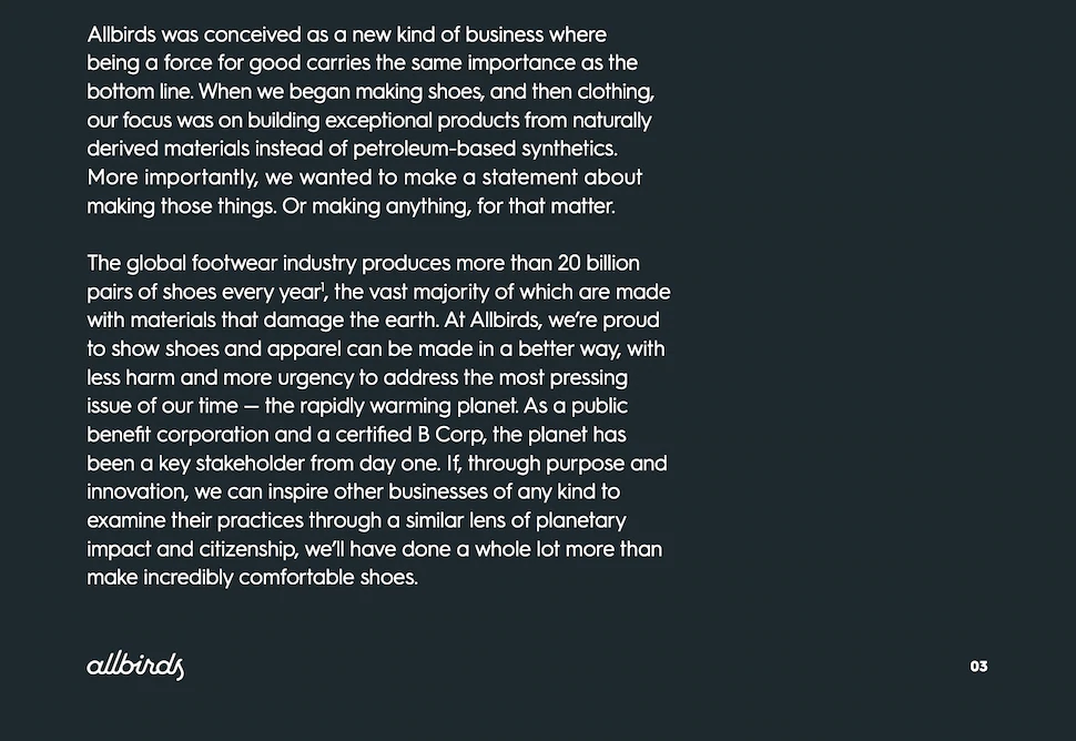 Allbirdsはまた、エグゼクティブサマリーを使用して、ミッション主導型の会社を説明しています。 持続可能性はAllbirdsブランドの主要な特徴であり、持続可能性レポートは、会社の環境への影響に関心のある消費者と投資家によって読まれます。 そのため、2020年のサステナビリティレポートのエグゼクティブサマリーを使用して、会社の環境に配慮したイニシアチブを強調しています。