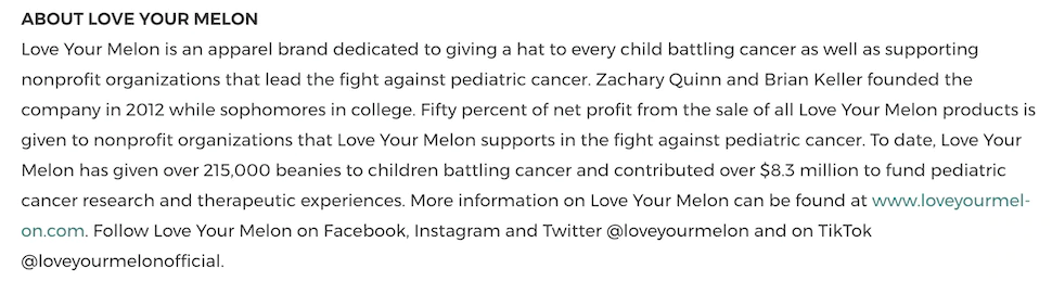 ここでは、エグゼクティブサマリーのタイトルは「AboutLove Your Melon」で、小児がんと闘うというブランドの使命について説明しています。 Love Your Melonには、特定の指標も含まれています。これは、特に数字が嘘をつかないため、説得力のある目的に常に理想的です。215,000の贈り物の帽子を子供に、830万ドルの寄付を売り込んでいます。 さらに、エグゼクティブサマリーは、読者がソーシャルメディアでブランドについて詳しく知るための召喚状(CTA)を提供します。