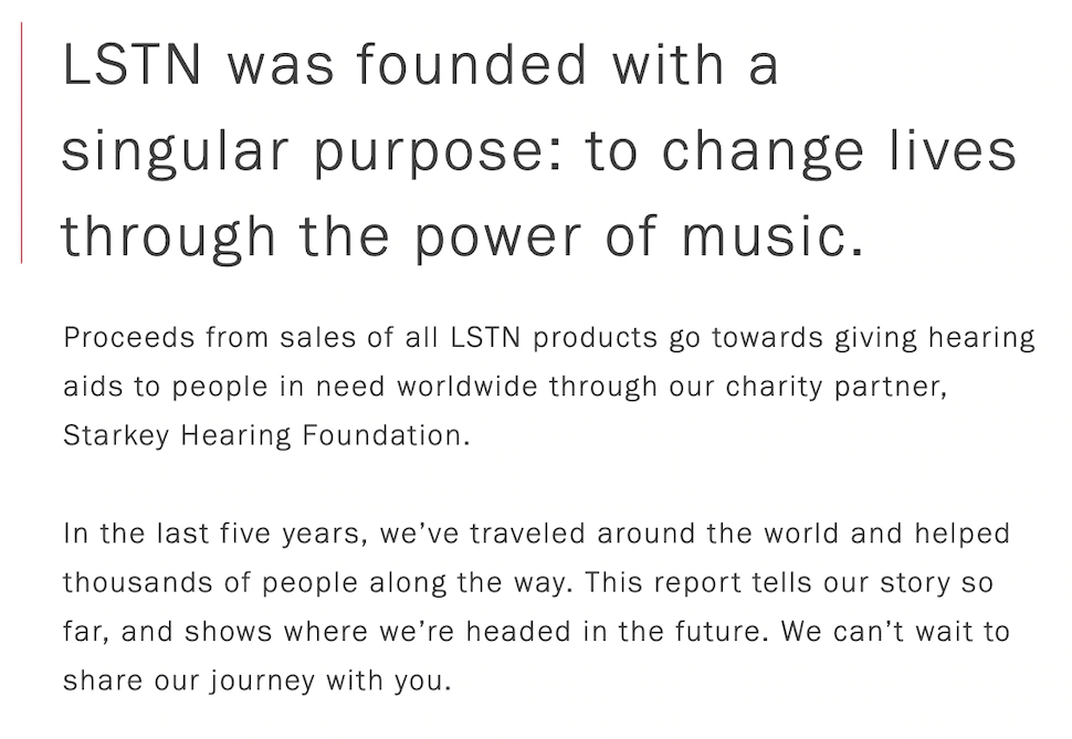 LSTN Sound Co.は、企業の社会的責任(CSR)に取り組むもう1つのブランドです。 そのため、年次影響レポートを発行しています。 専用のエグゼクティブサマリーはありませんが、それ自体、レポートの冒頭にその役割を果たすセクションがあります。 レポートは、ブランドとその使命についての記事から始まります。