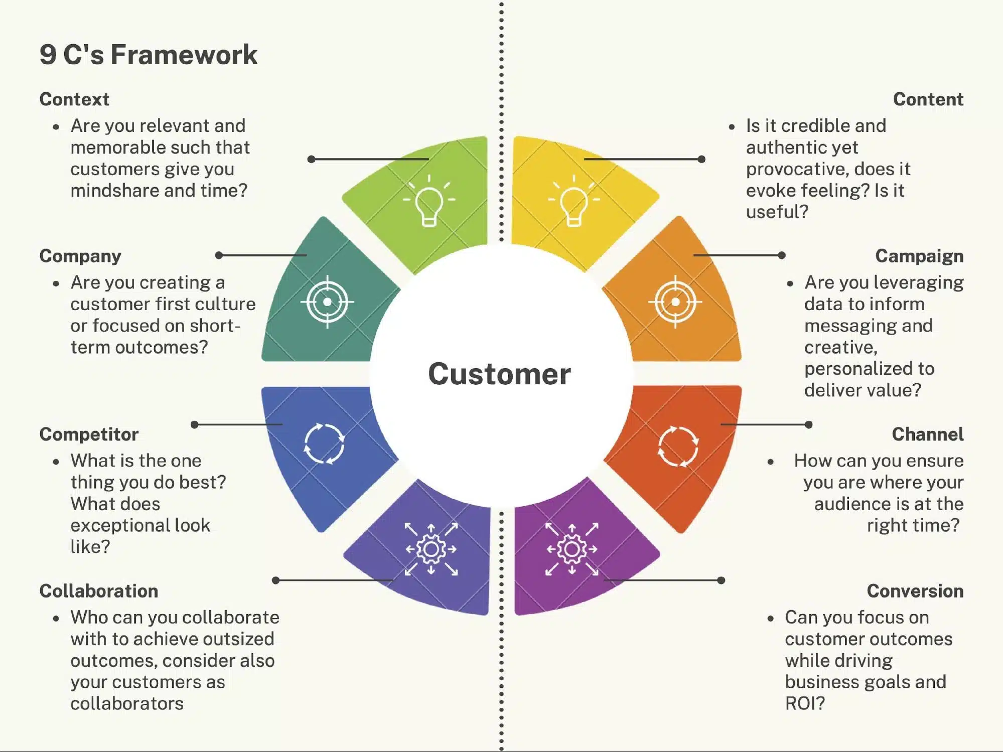 上でわかるように、9C のフレームワークは 8 つの異なる概念を組み合わせて、顧客をマーケティング キャンペーンの中心に据えます。