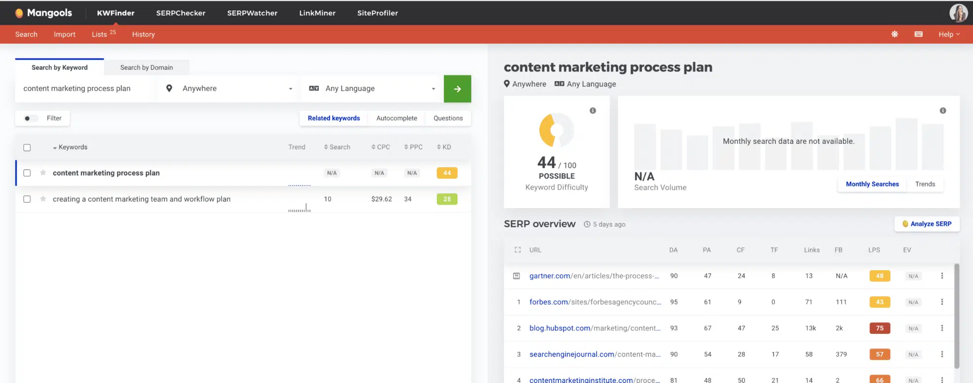 ここで言及する価値のあるもう 1 つの強力なツールは、Mangools の KWFinder です。これは、毎月の検索数、CPC、競合レベルに関する詳細なデータを提供し、理想的なキーワードの並べ替えと検索をこれまでより簡単にします。 これは、キーワードを見つけるのに役立つお気に入りのツールの 1 つで、毎日使用しています。