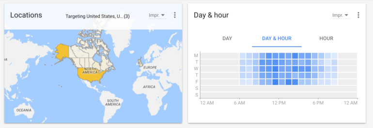 - [ディメンション]タブの古いディメンションの一部が欠落していますが、[広告スケジュール]に移動すると表示する選択肢が表示されるなど、最も意味のある場所で存在するディメンションの多くを簡単に見つけることができます。 「Day&Hour」、「Day」、「Hour」。 「曜日」がありません。 [場所]タブを見ると、ユーザーの場所のディメンションが表示されます。 新しいダッシュボードがすべての広告主に公開されると、Googleが不足しているデータポイントを埋めると思います。