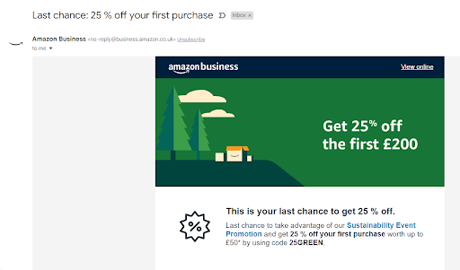 BOFU のメール キャンペーンで、英国の Amazon ビジネスはプロモーション割引を提供して、潜在的な顧客にアカウントへのサインアップを促しました。 件名に「ラストチャンス」という言葉を入れることで、メールは切迫感を生み出します。 購入割引オファーと組み合わせることで、これは B2B の世界におけるボトム ファネル マーケティングの強力な例となります。