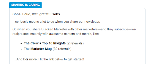 Stacked Marketer のニュースレターを読んだことがあれば、マーケティングのプロと取引していることがわかります。 購読者は、毎日の電子メール ニュースレターを介して、最新のニュースと最新のマーケティング情報を受け取ります。 Stacked Marketer は、ニュースレターで定期的に宣伝されている紹介プログラムを使用して、目標到達プロセス後のマーケティングに取り組んでいます。 シンプルですが効果的です。現在のサブスクライバーは、新しいサブスクライバーを紹介することで、限定コンテンツや商品にアクセスできます。