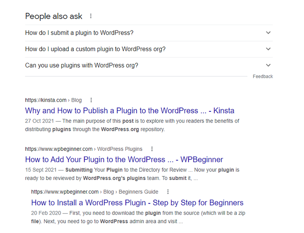 有料のトラフィックは予測不可能/信頼性が低く、多額の予算を確保するのは難しいため、フリーミアムモデルを採用し、WP.orgからのサポート/配布に依存する場合、新規参入者は製品の成長を達成する可能性が高くなります。 その理由は、リポジトリはGoogleの最初の検索イントロスペクションによってWordPress関連のすべての権限であると見なされ、ドメイン権限が高いため、SEOが豊富な.orgリストはWPBeginnerからのページをバイパスする可能性が非常に高いためです。