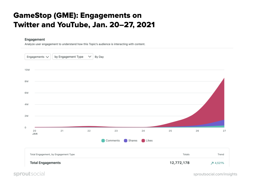 GameStopとr/WallStreetBetsをめぐる社会的な会話は、この1週間で熱くなり始めました。 1月20日から1月27日まで、Googleで82,000を超えるRedditの「GME」に関する言及があり、Sprout SocialAdvancedListeningはGameStopに関する1,582,000を超えるツイートと1,465を超えるYouTube動画をキャプチャしました。 同じ期間に、TwitterとYouTubeでの会話だけでも、100億回近くのインプレッションが発生する可能性があり、合計で1,280万回近くのソーシャルエンゲージメント(いいね、コメント、共有)が発生しました。