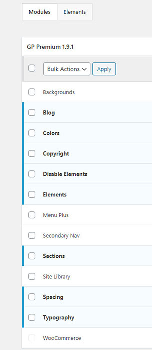 GeneratePress Premiumは、GeneratePressテーマと一緒に機能する有料プラグインです。 プレミアムバージョンを使用して、別の機能セットであるモジュールをアクティブ化できます。 次のモジュールにアクセスできます:背景、ブログ、色、著作権、要素の無効化、要素、メニュープラス、セカンダリナビゲーション、セクション、セクション、サイトライブラリ、間隔、タイポグラフィ。