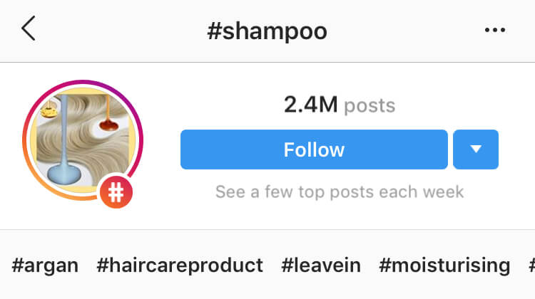 Instagram の「関連する」ハッシュタグの提案を調べてください。 Instagram アプリで #shampoo を検索すると、他の関連アカウントが使用および検索している内容に基づいて、類似のハッシュタグが表示されます。 このような場合、Instagram のアルゴリズムが非常に役に立ちます。視聴者にリーチして「いいね!」を獲得するために適切なニッチなハッシュタグを確実に選択できるからです。