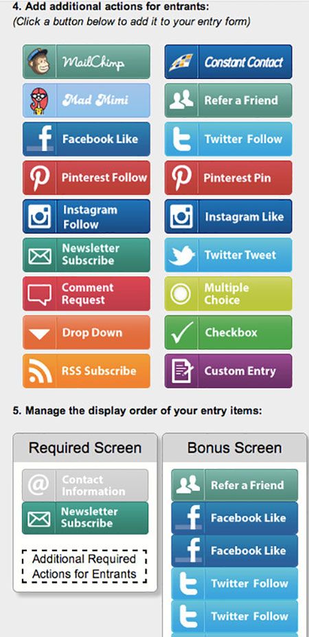Giveaway Toolsは、ブログのコメント、RSSサブスクリプション、Twitterのフォロー、Facebookページの「いいね」など、さまざまな組み込みのエントリフォームを提供します。 カスタムエントリタイプを作成するオプションもあります。