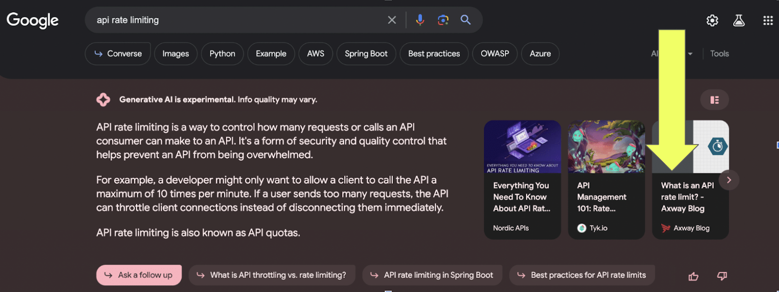 この API レート制限検索クエリの例は、業界トップクラスのリーダーである Axway が現在従来の検索で所有しているものです。 この記事では、ベータ版における貴重な AI スナップショットの位置もキャプチャします。