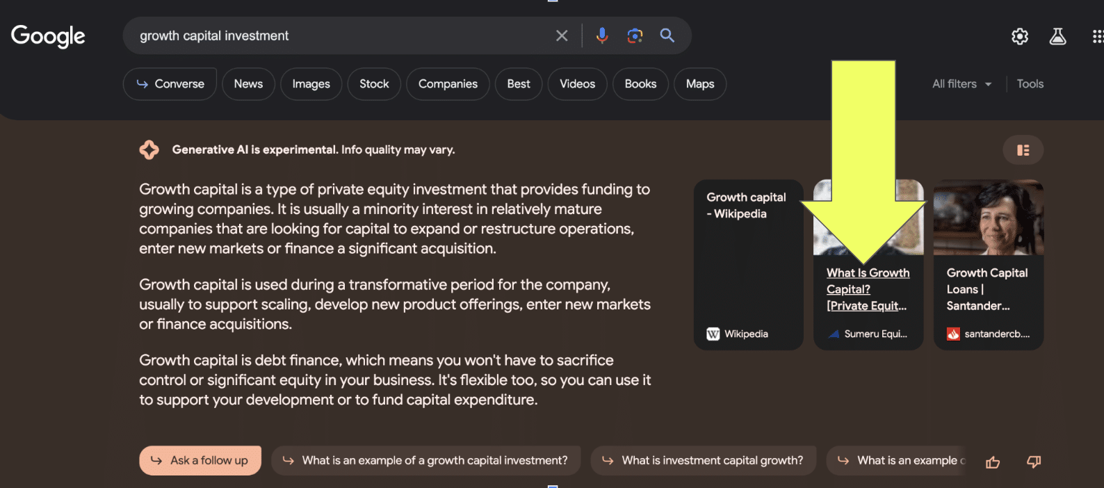 彼らが公開したこの成長資本投資に関する記事は、SME がホストするポッドキャストを拡大したものです。 この記事はトラフィックを促進し、Google の生成 AI 検索エクスペリエンスにおけるカルーセル ランキングをキャプチャします。