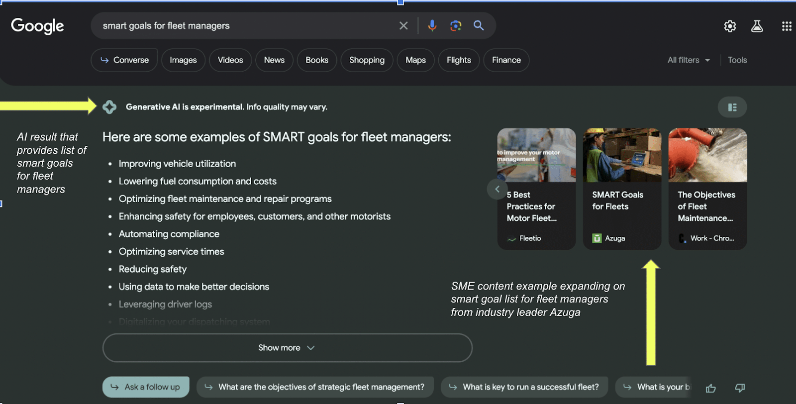 生成 AI の結果により、目標のリストが提供されます。 AI スナップショット カルーセルには、フリート業界のリーダーからの SME コンテンツを含むクリック可能なカードが備わっています。 それらの主題の専門家の 1 人が Azuga で、彼はこのクエリの従来の 1 位ランキングも所有しています。