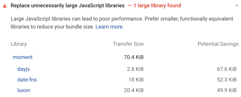 注目すべきライブラリであるMomentJS(2020年9月の時点で週に1200万ダウンロード)は、Lighthouseがいくつかのより良いオプションを持っていると指摘した最初のライブラリです。 ここでのGoogleの論理は反駁できず、かなりよく知られています。 これに応じて、Moment自身のホームページとドキュメントは、Lighthouseのレポートで提供されたアドバイスを反映しています。 モーメントは機能が凍結されており、安定性の更新のみが計画されています。