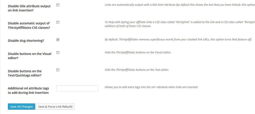- スラッグ短縮を無効にする–デフォルトでは、ThirstyAffiliatesはクロークされたリンクURLから不要な単語を削除します。このオプションは、その機能をオフにします。