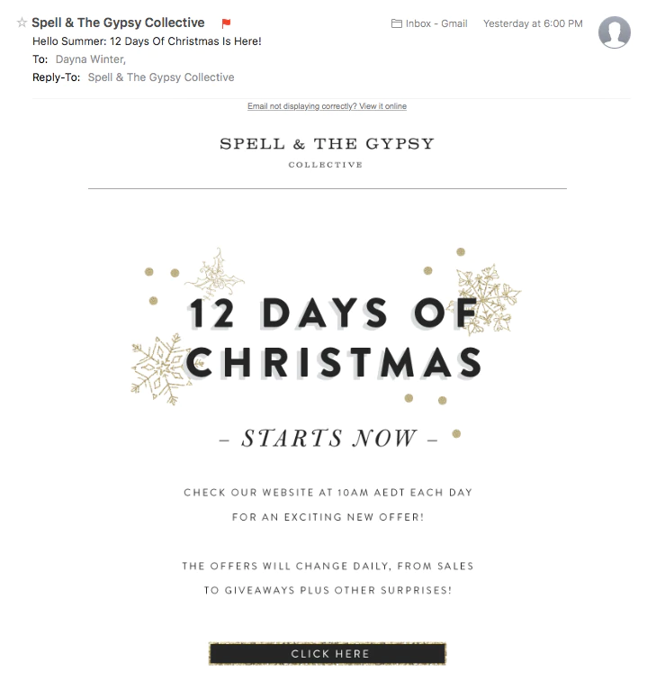 - Shopifyを利用したSpell&Gypsy Collectiveのこのキャンペーンのように、時間指定または毎日のギフトのアイデアやお得な情報をお試しください。