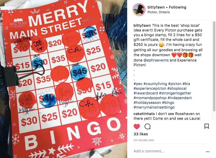 - 実店舗がある場合は、近所の他の企業を結集して取り組みを組み合わせることを検討してください。 オンタリオ州ピクトンのBIAは、ホリデービンゴを運営しており、地元の人々がメインストリートに沿ってお金を使い、賞品を獲得するためにプレーすることを奨励しています。