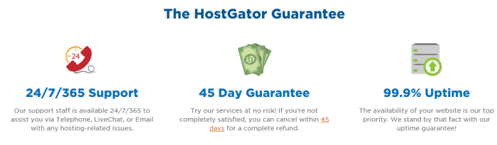 全体として、HostGator は優れたカスタマー サポートを提供します。 HostGator はここでほとんどの競合他社よりも優れており、45 日間の保証を提供していますが、上級ユーザー向けのトップピックである Dreamhost はさらに寛大で、97 日間の保証が印象的です.