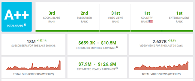 ただし、彼のチャンネルは米国に拠点を置いているため、彼の月収は T シリーズと同様で、推定範囲は 659,300 ドルから 1,050 万ドルです。