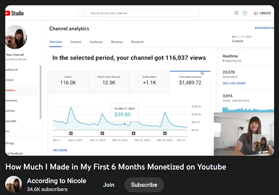 ニコル氏によると、登録者数 34,000 人の個人金融ビデオを作成する YouTuber は、プラットフォームで収益化した最初の 6 か月間で得た収入を文書化しました。