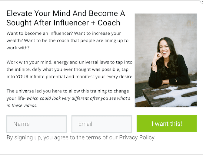 - 彼女のウェブサイトのリードマグネットは、電子メールのサインアップと引き換えに無料のトレーニングを提供しています。 これは、彼女が新しい見込み客からメールアドレスを収集する方法です。