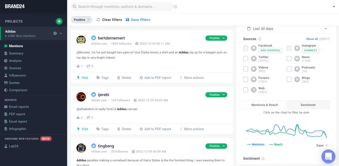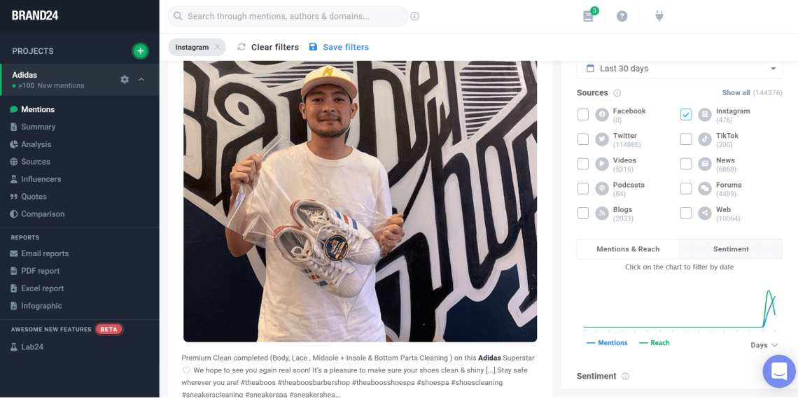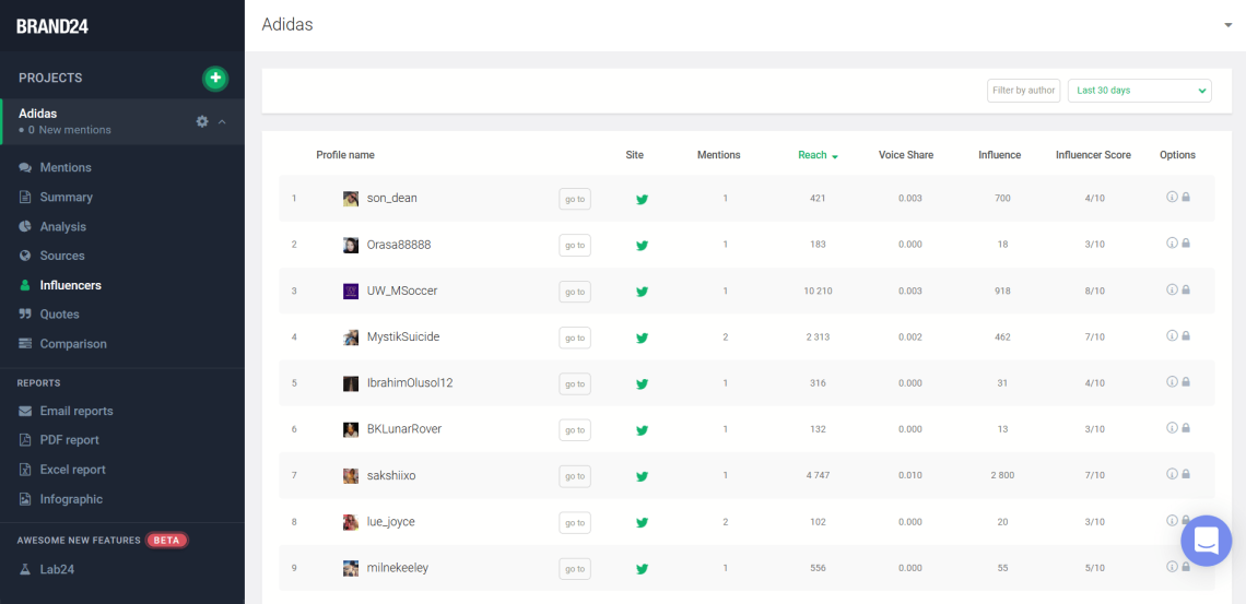 しかし、アディダスが代わりに小規模なインフルエンサーとのコラボレーションを好むと判断した場合でも、問題はありません。 Brand24 を使用すると、誰でもそれらの多くを識別できます。