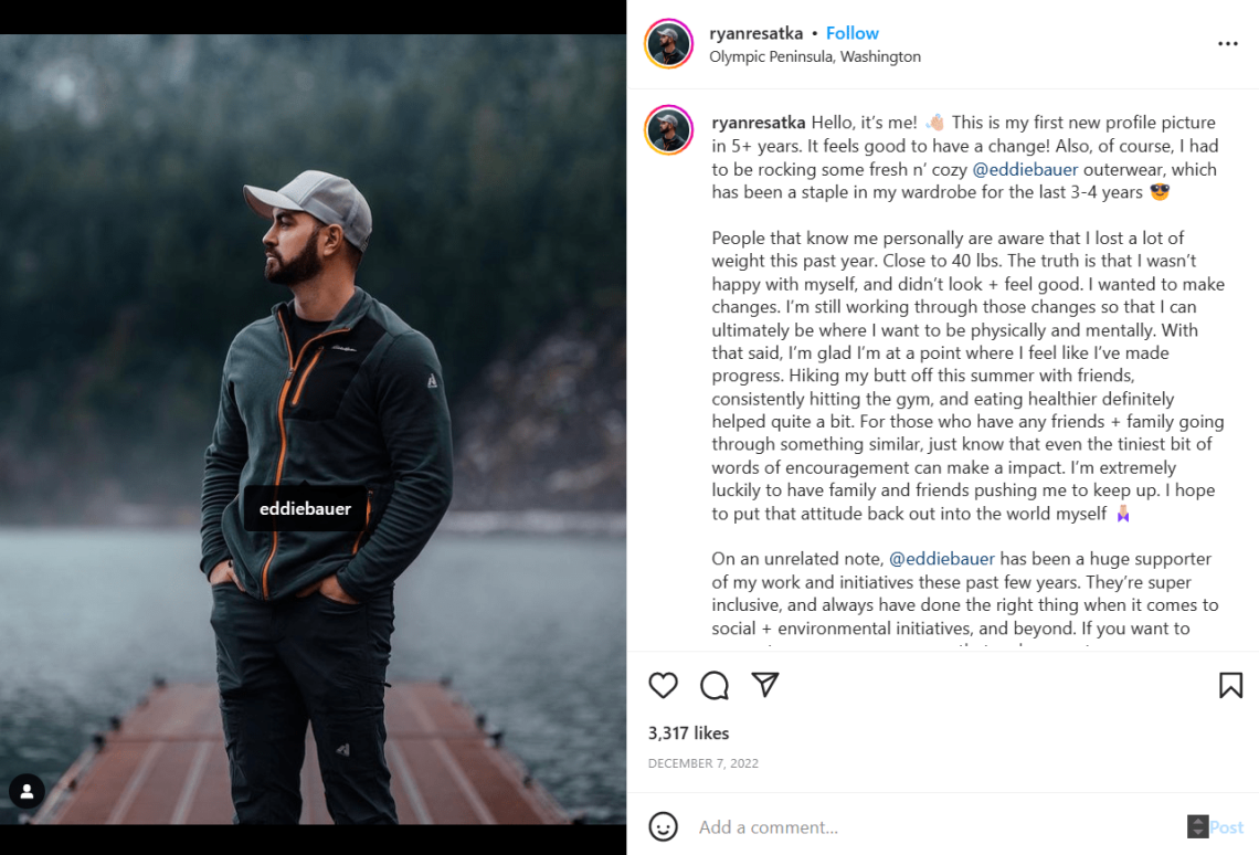 ライアンは、数年前からインスタグラムの寄稿者としてエディー・バウアーというブランドを代表しています。 インフルエンサーと他のブランドとのコラボレーションを見るのはいつでも良いことです. このようにして、彼らが Instagram インフルエンサー マーケティング キャンペーンをどのように管理しているかを確認できます。