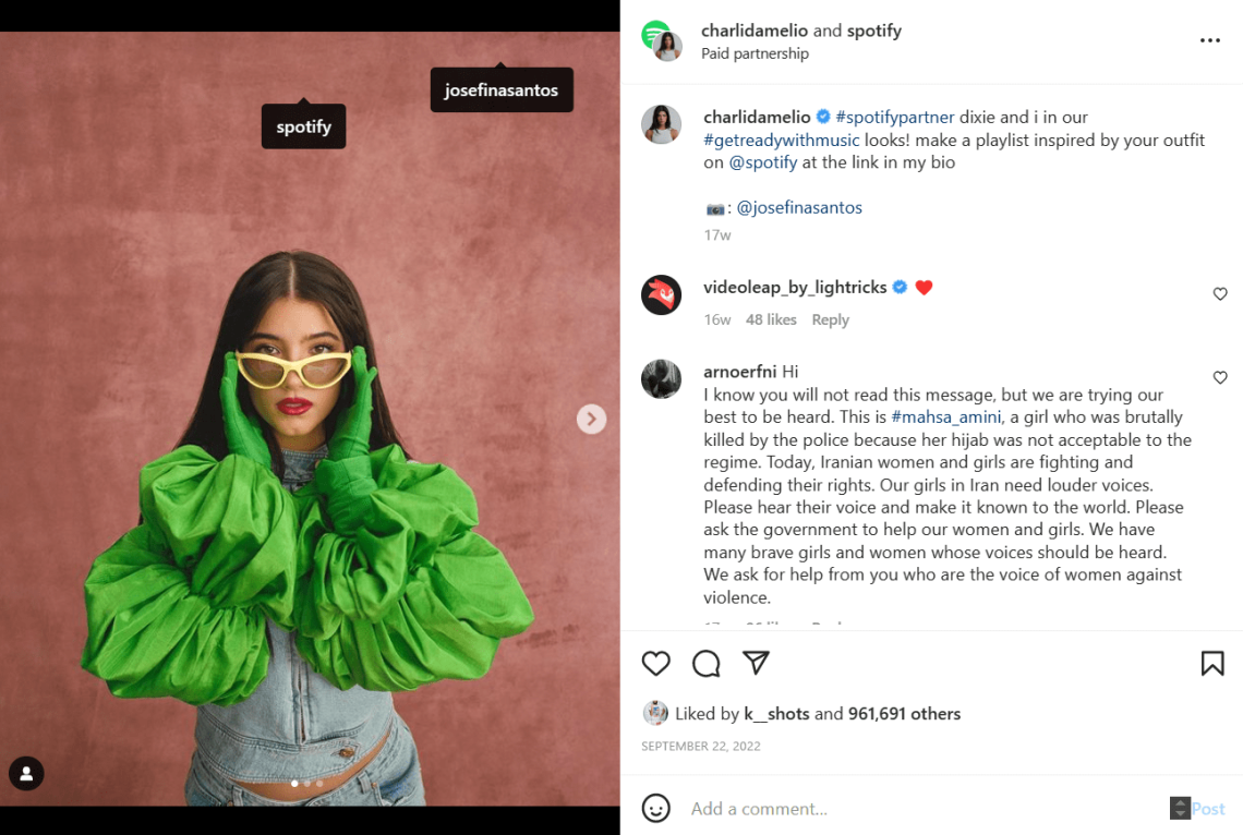 ここでは、ソーシャル メディア インフルエンサー マーケティング キャンペーンの好例を見ることができます。 それが Charli D'Amelio と Spotify のコラボレーションです。