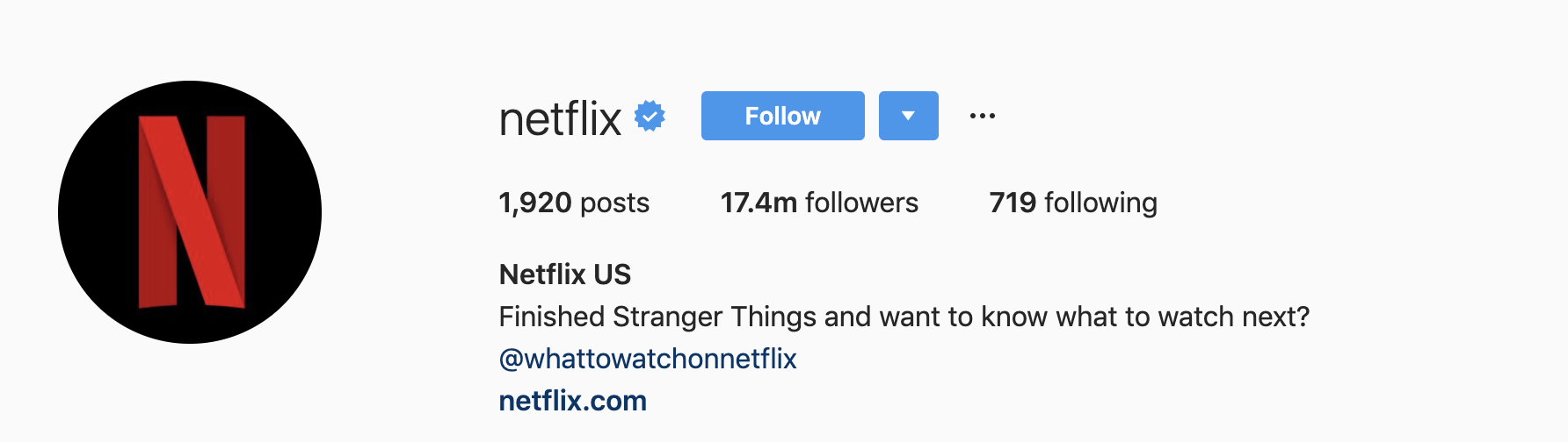 これは、青い検証済みバッジを紹介するNetflixのInstagramプロファイルの例です。