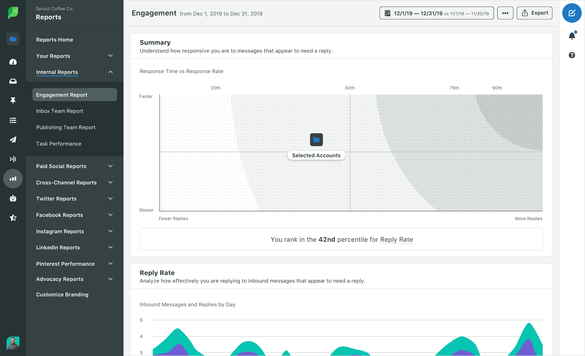 SproutのInstagramAudienceEngagement Reportは、トレンド、ハッシュタグの使用状況、いいね、その他のエンゲージメント指標に関する詳細な洞察を提供します。 これは、アカウントまたはブランド間で分析を容易にしようとしているブランドにとって重要です。