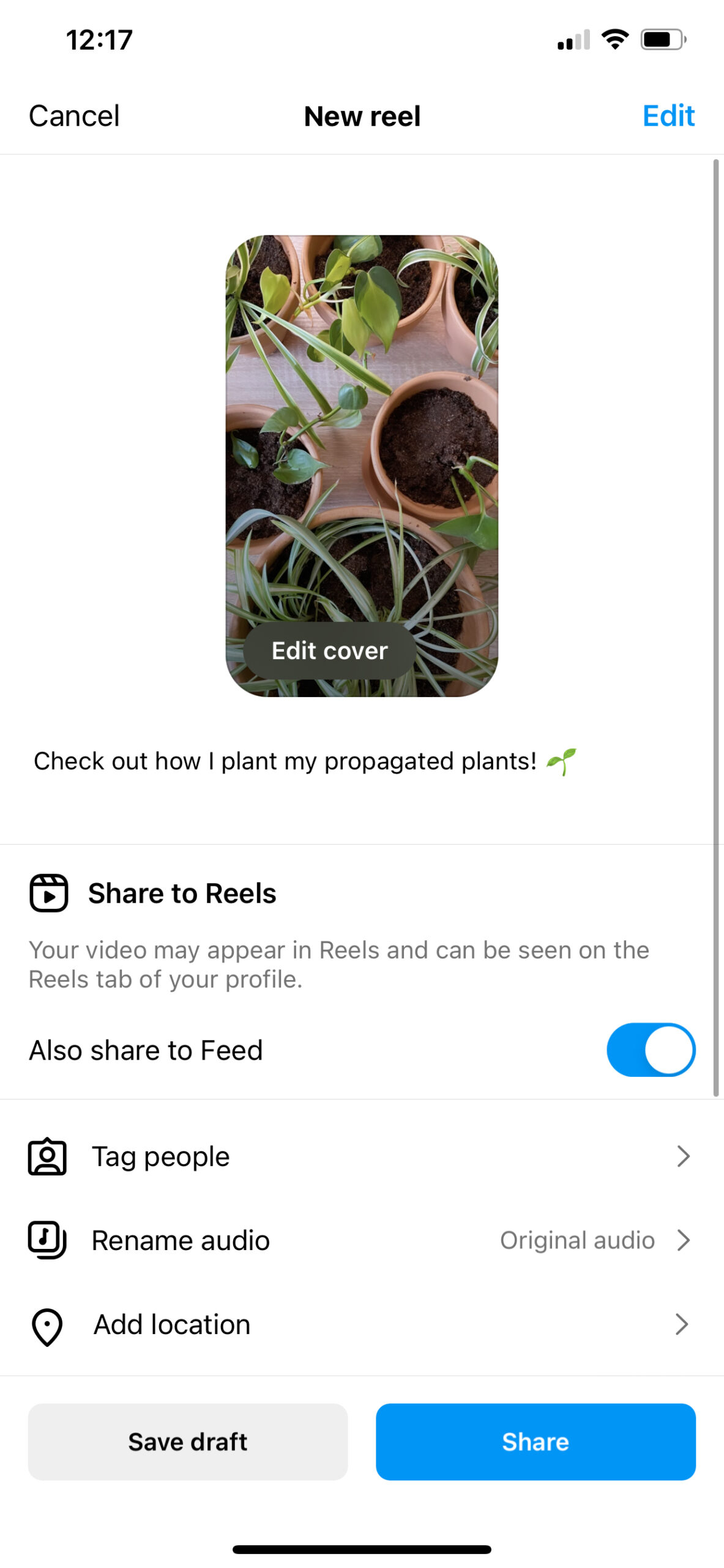 - リールをフィードに共有するかどうかを選択してください:私の経験では、フィードに共有するとリーチが広がります。