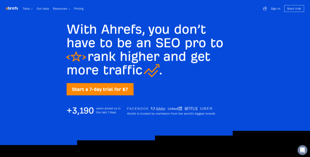 Ahrefsは、完全なSEOスイートであり、キーワード調査用の強力なツールセットが含まれているという点で、SEMrushに似ています。