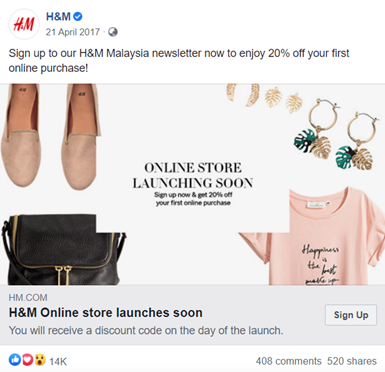 繰り返しになりますが、Facebookでの投稿を後押しするときは、クーポンコード、割引、プレミアムコンテンツなど、サインアップと引き換えに便利なコンテンツを無料で提供するようにしてください。
