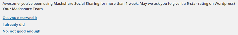 プラグインは5つ星の評価ウィジェットであり、プラグインがユーザーに提供する主な価値は、読者とのエンゲージメントです。 この値は、ブログの所有者の投稿が受け取った投票数によって簡単に定量化できます。 サイトがより多くの票を獲得するにつれて、プラグインはサイト所有者にとってより価値のあるものになります。 そのため、サイトの投票数が制限を超えたときに「プラグインの確認」通知をトリガーすることをテストしました。 Mashshareの場合、バリューベースのトリガーは社会的に共有された投稿の数である可能性があります。 プラグインごとに価値提案が異なるため、プラグイン開発者は、プラグインの主な利点を数値に数値化する方法を理解する必要があります。