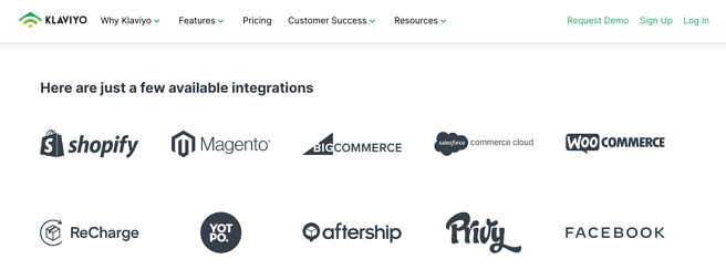 Klaviyoの統合には、Shopify、Magento、BigCommerce、Salesforce Commerce Cloud、WooCommerce、AmazonMarketplaceなどの主要なeコマースプラットフォームがすべて含まれています。 また、ReCharge、Yotpo、Aftership、Privyなどの小規模なeコマースプラットフォームともうまく統合できます。 Klaviyoには、JavaScriptを介した非常に便利なカスタムプラットフォーム統合オプションもあります。 もう1つの便利な統合は、Facebookのカスタムオーディエンスとの統合です。これにより、マーケターは電子メールを超えてFacebookの広告エクスペリエンスをパーソナライズできます。
