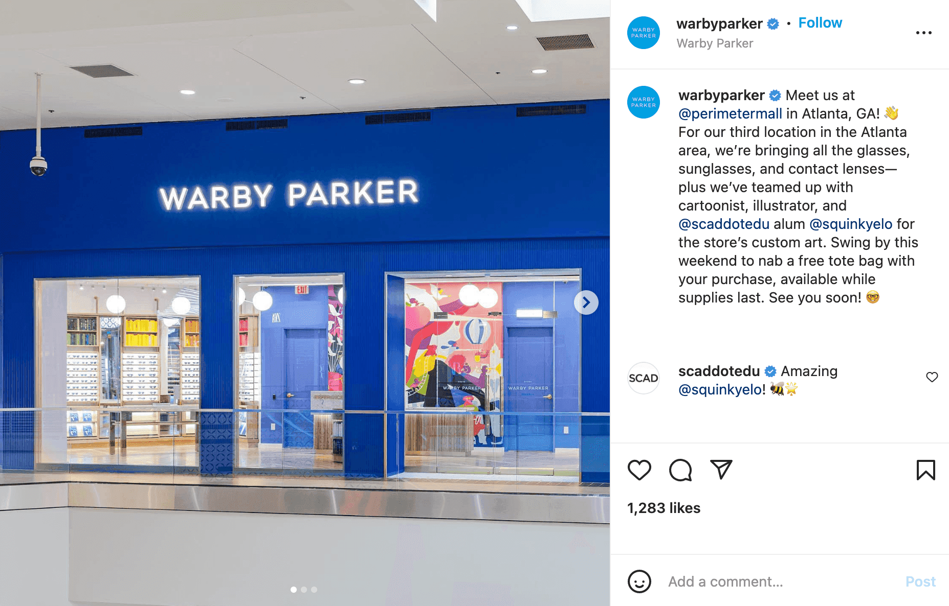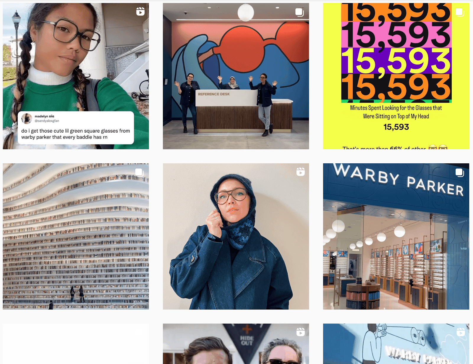 写真やビデオを共有して、世界中のフォロワーが会社のイベントをのぞき見できるようにします。 この例では、Warby Parker が開店イベントに関するニュースを広めました。