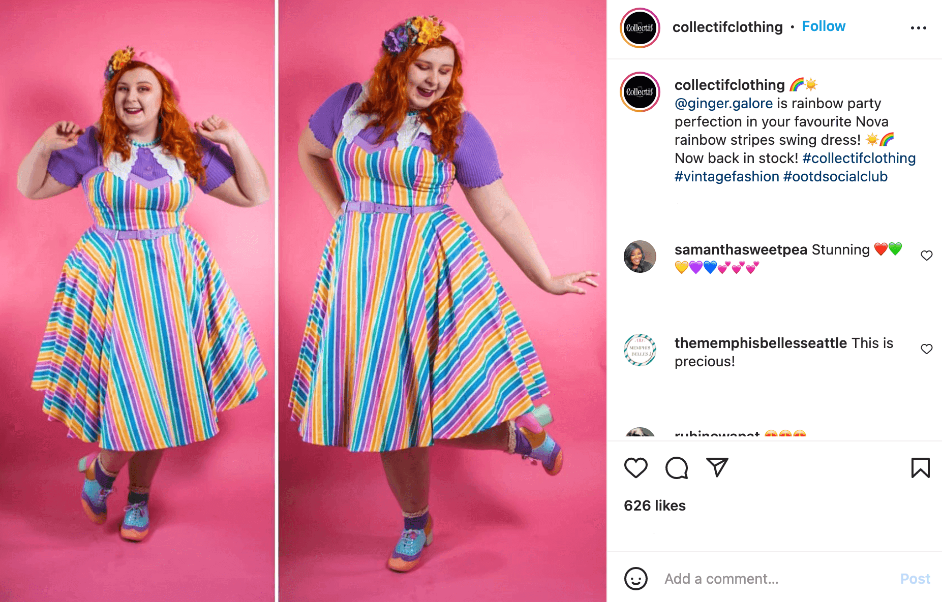 有名人ほど多くのフォロワーがいない場合でも、ほぼすべての業界の Instagram インフルエンサーを見つけることができます。 実際、大規模なフォロワーよりも熱心なフォロワーを持つインフルエンサーを選択することは、特にニッチな業界で波を起こす必要がある場合に役立ちます. インフルエンサー キャンペーンに応じて、インフルエンサーと一緒にオリジナル コンテンツを作成したり、インフルエンサーからコンテンツを再投稿したりできます (許可を得て)。 以下の例では、Collectif は後者のオプションを選択しました。
