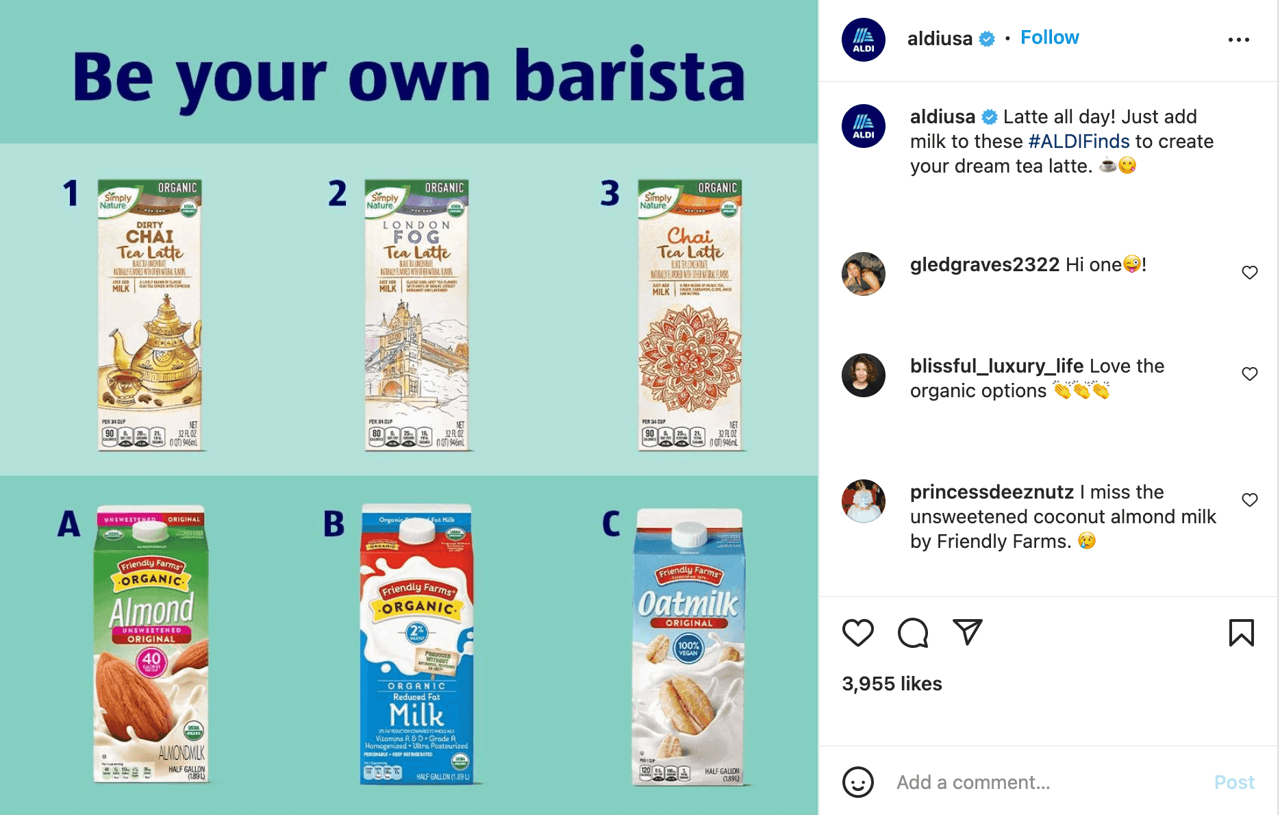 ソーシャル メディア用のデザイン チームと協力して (またはビジュアル コンテンツ ツールを使用して)、Instagram 用のユニークな画像を作成します。 この例では、ALDI は製品の写真をオリジナルのグラフィックで使用し、フォロワーに好きな組み合わせを選ぶように求めています。