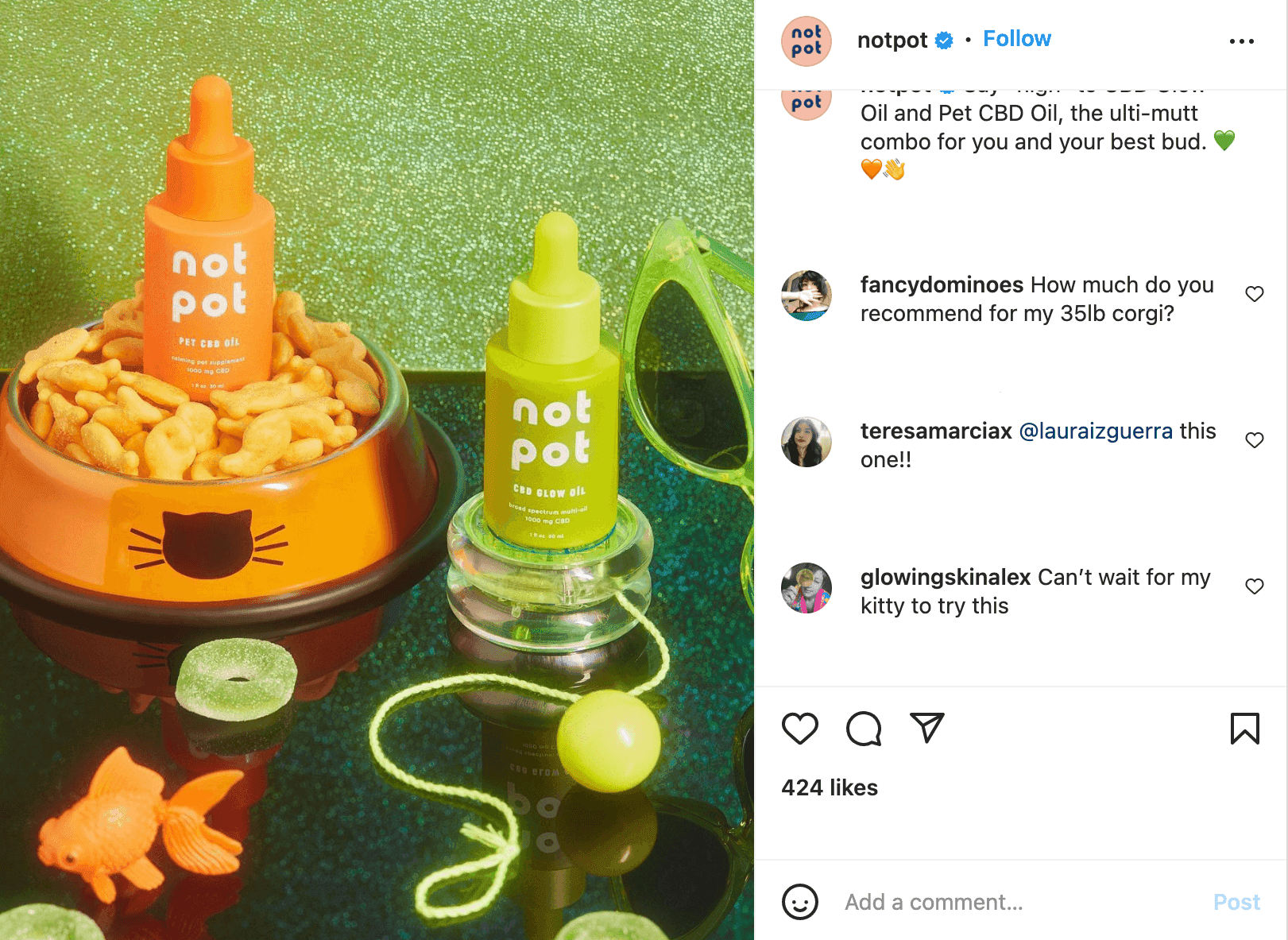 Instagram の e コマース ブランドには、フィードで製品を披露する機会がたくさんあります。 このプラットフォームでは、CBD ブランドの Not Pot の遊び心のある例のように、製品の写真で視覚的なブランドを表現する余地があります。