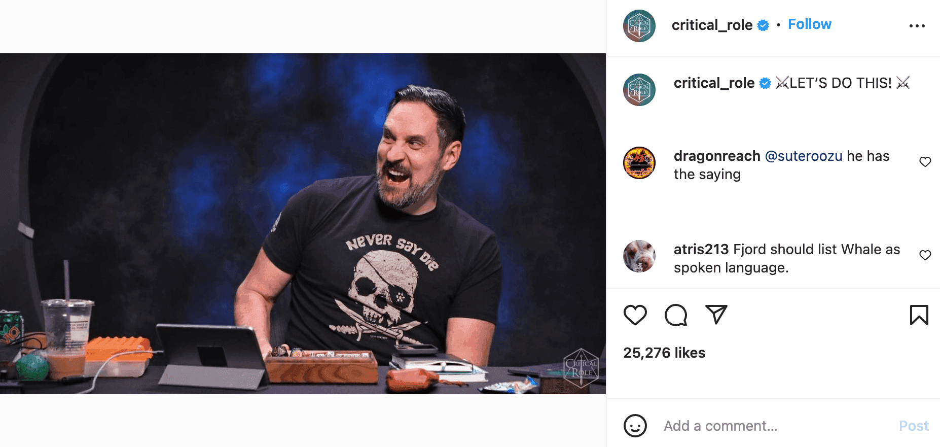 あなたの会社がライブ イベントを主催している場合、扱うべきオリジナル コンテンツがたくさんあります。 これらのイベントは、タイムリーな Instagram ストーリーの機会も提供します。 オンライン Web シリーズの Critical Role は、毎週木曜日にキャスト メンバーの写真をセットに投稿して、議論を刺激し、視聴者にライブであることを思い出させます。