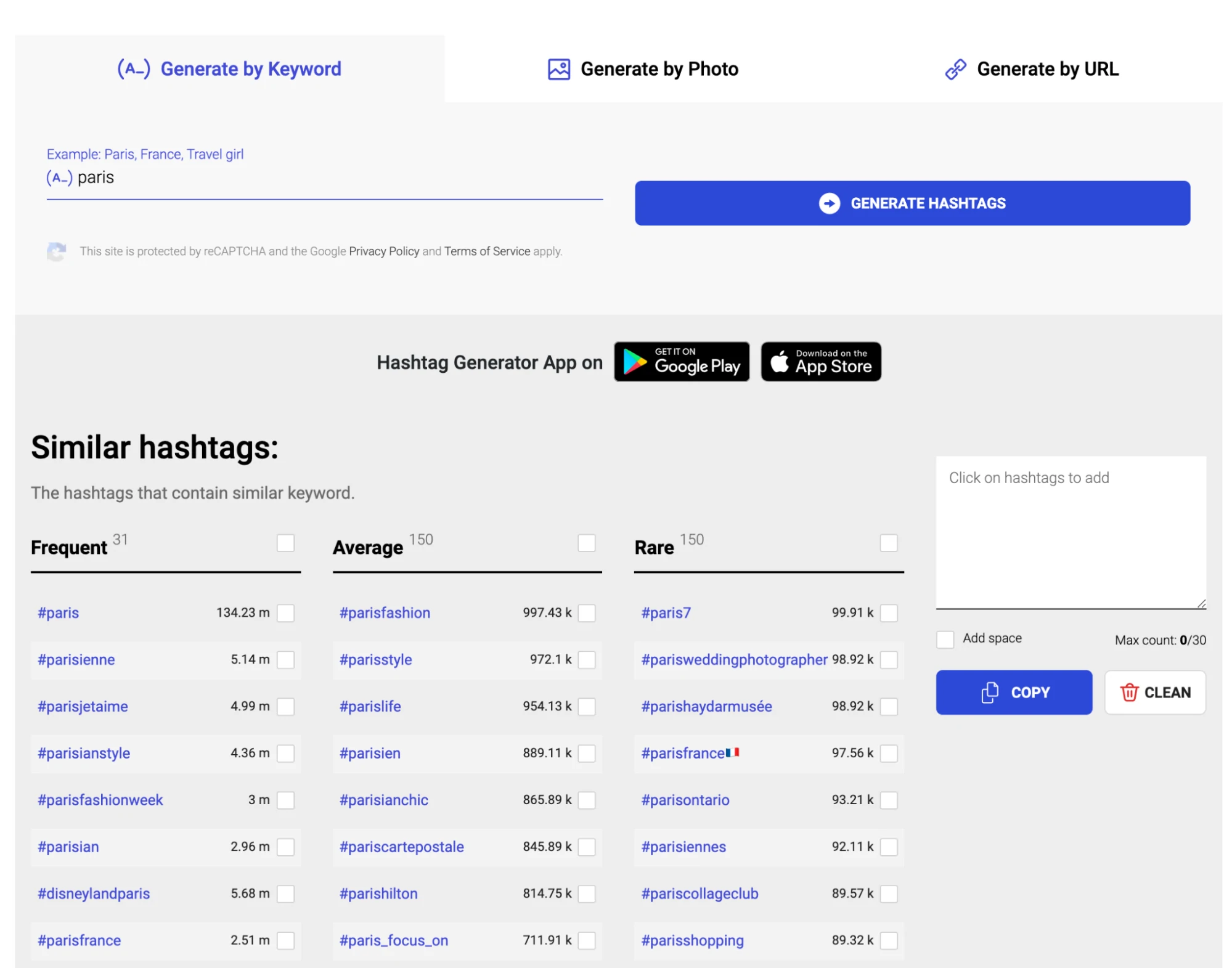 Inflactは、フィード投稿、ストーリー、リールに役立つもう1つのInstagramハッシュタグツールです。 ツールを使用する最も簡単な方法は、キーワードを使用することです。 たとえば、ジェネレーターに「Paris」と入力すると、キーワードを含むいくつかの異なるハッシュタグが表示されます。 ハッシュタグは、頻繁な、平均的な、そしてまれなユースケースに分類されます。