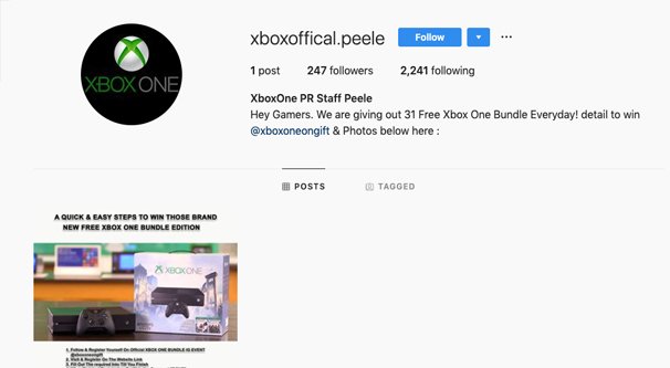 (この記事を読んでいる時点でそのアカウントがなくなっている場合、それはプロフィール写真に Xbox のロゴが入った、公式アカウントに見せかけるために「xboxofficial.peele」という名前の単なるダム アカウントです。同時に、数百人のフォロワーしかなく、プロフィール情報もなく、何千人もの人々をフォローしており、投稿が 1 つしかなく、これは無料の Xbox を獲得するための詐欺です。明らかにフィッシング アカウントとして使用されています。)