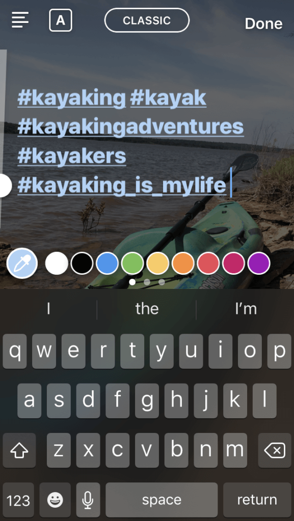 - 複数のハッシュタグを使用するには、テキストを使用してハッシュタグを入力し、カラーピッカーを使用してテキストの色を画像の大部分に一致させます。 これにより、ハッシュタグ(最大11個まで!)がプレーンビューで非表示になります。