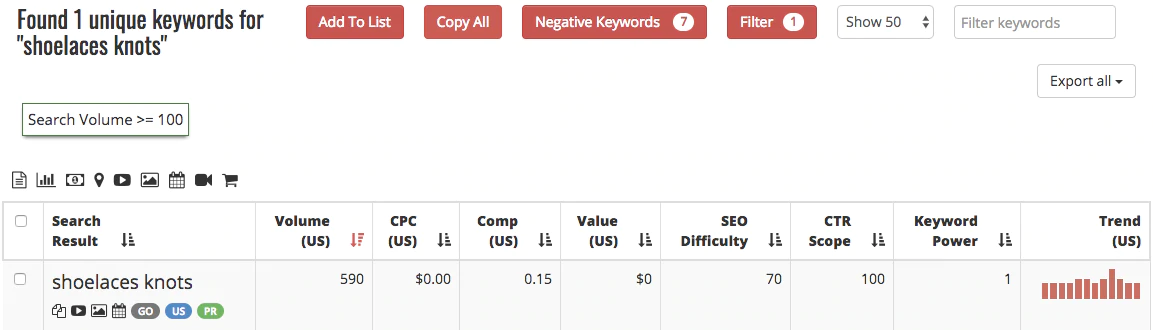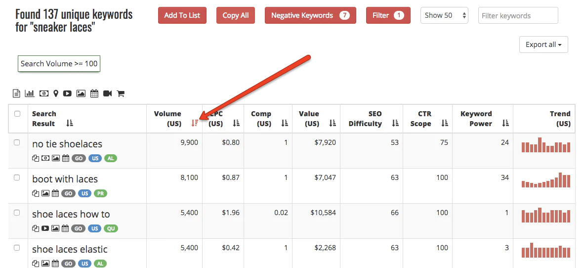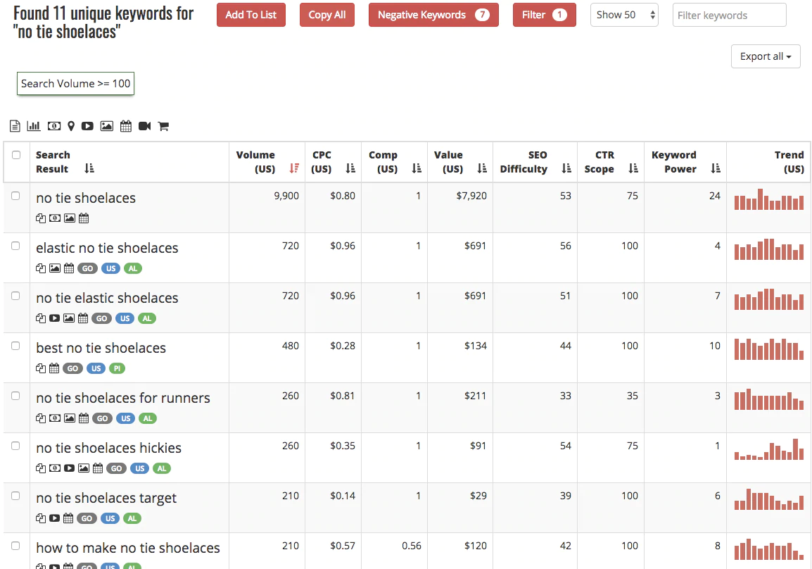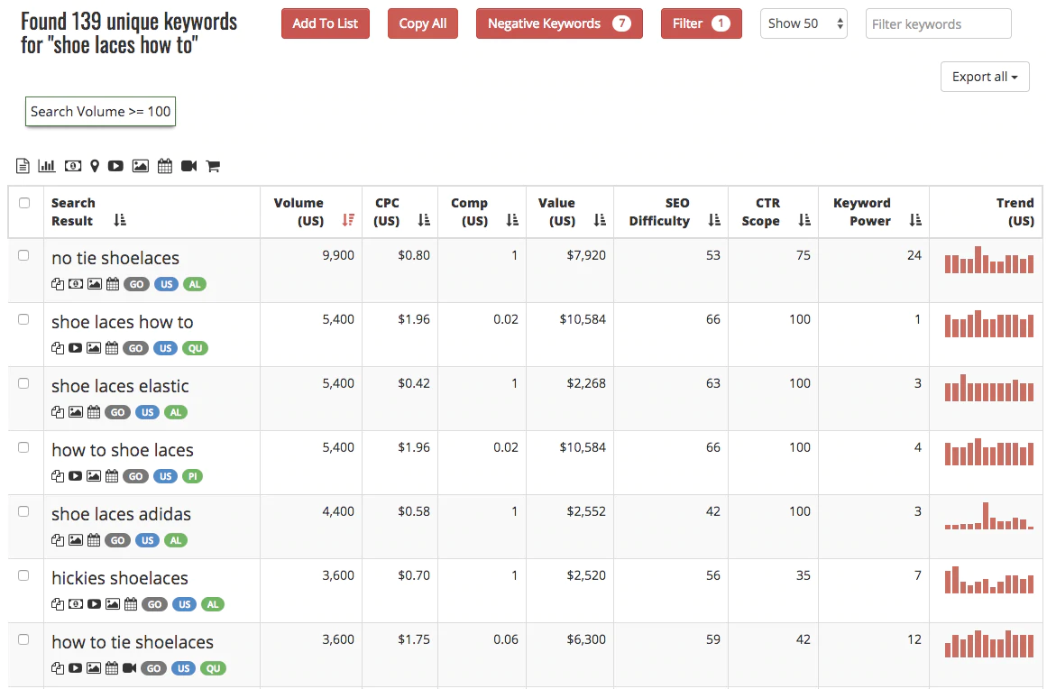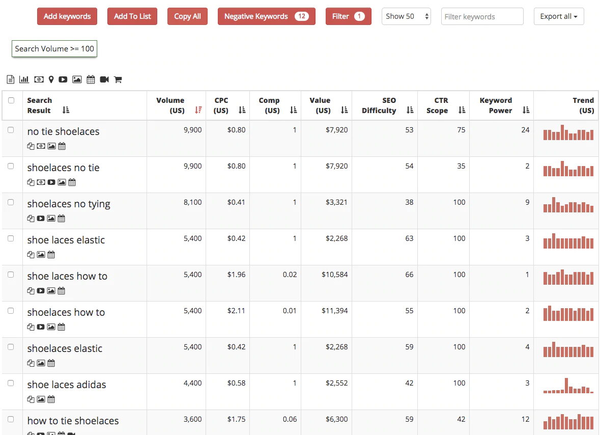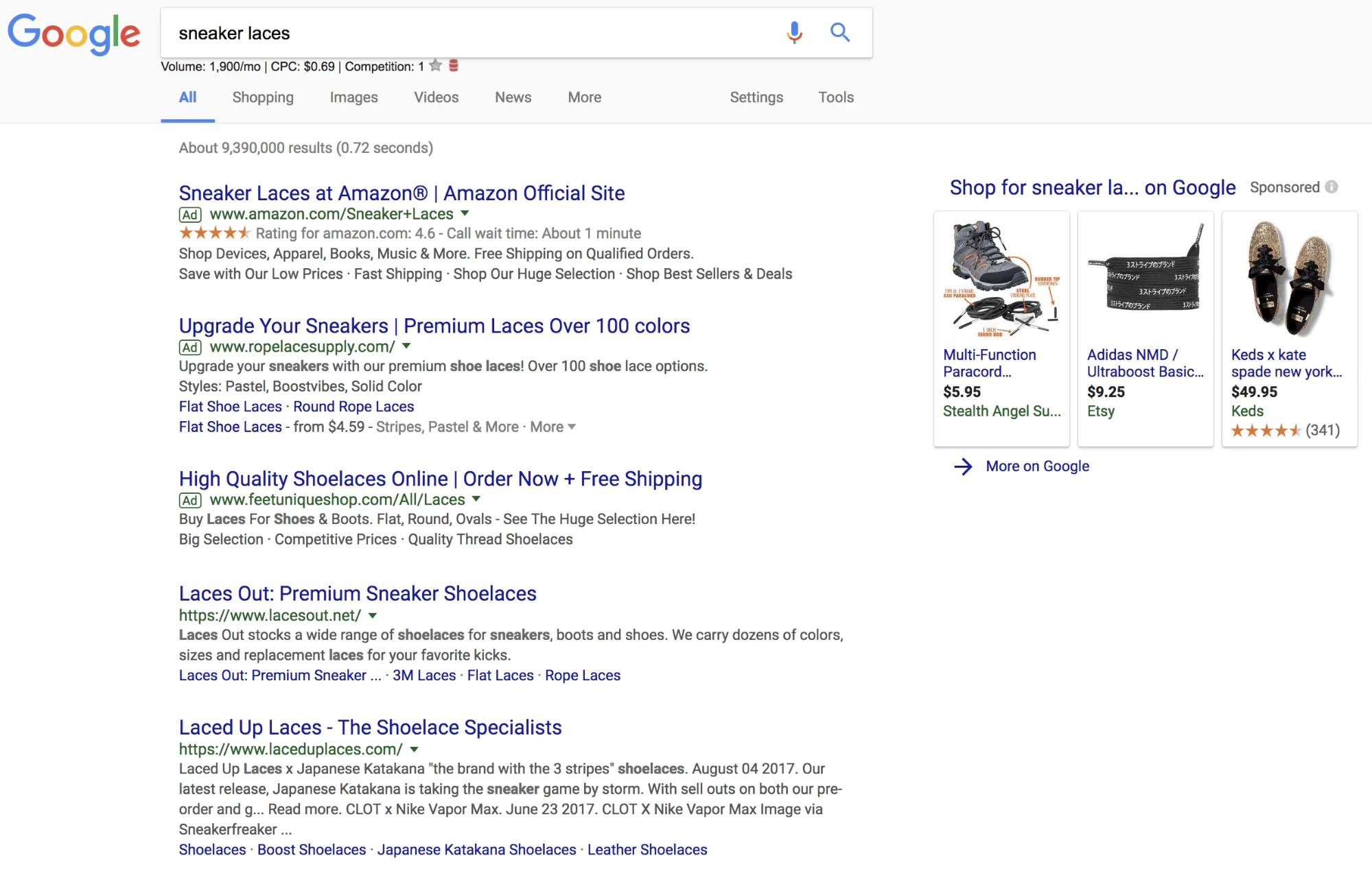 私は現在店主ではありませんが、スニーカーヘッドです。 それはあまりよく守られていない秘密です、ただ私が引き継いだクローゼットについて私の妻に尋ねてください。 しかし、勝つためのニッチですよね? したがって、スニーカーや特定のモデルのスニーカーを分析する代わりに、スニーカーの一般的なアクセサリである靴ひもを調べて、キーワードの調査をさらに1レベル下に進めましょう。