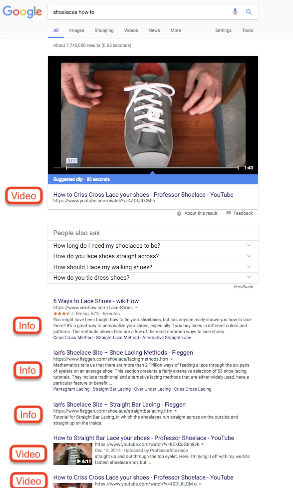 グーグルは、特定のクエリに対して特定の種類のコンテンツをランク付けすることを好むことを何度も示してきました。 特定の用語または一連の用語でランク付けする場合は、Googleが表示したいコンテンツの種類を構築する必要があります。