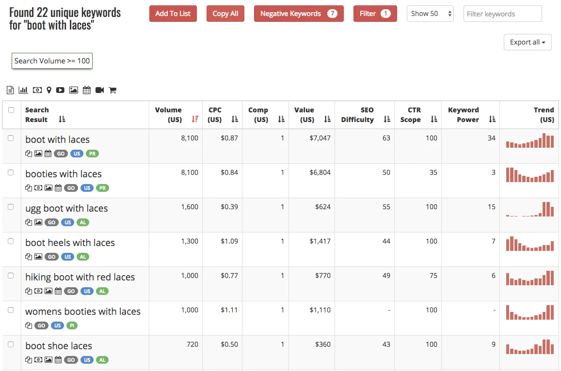 4. 「靴ひも付きブーツ」は、当社の製品構成とはあまり関係がありませんが、22の追加用語が含まれており、これらのキーワードを対象としたコンテンツページを作成するための強力な根拠となります。